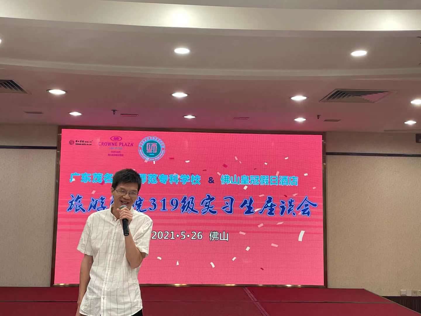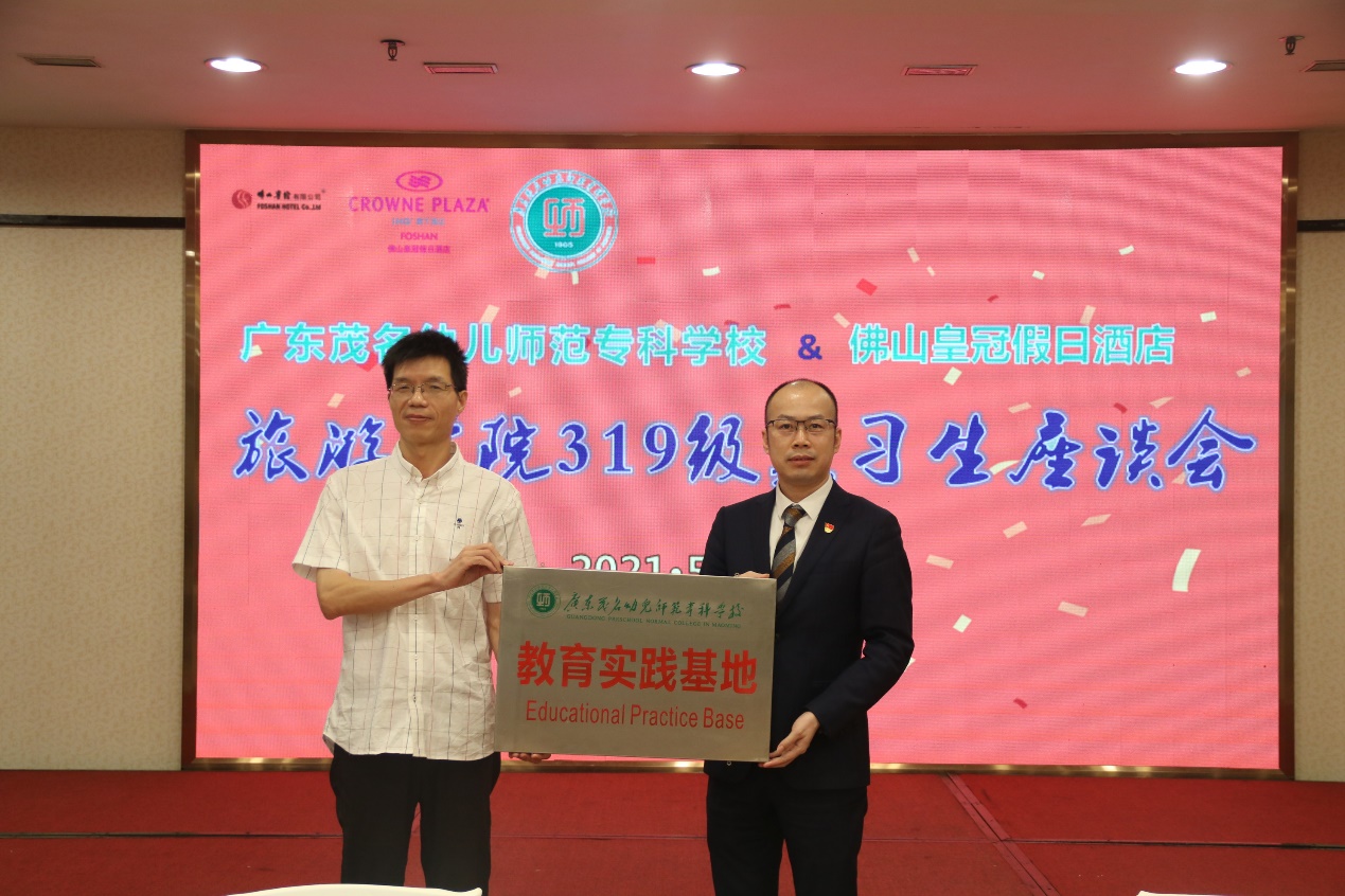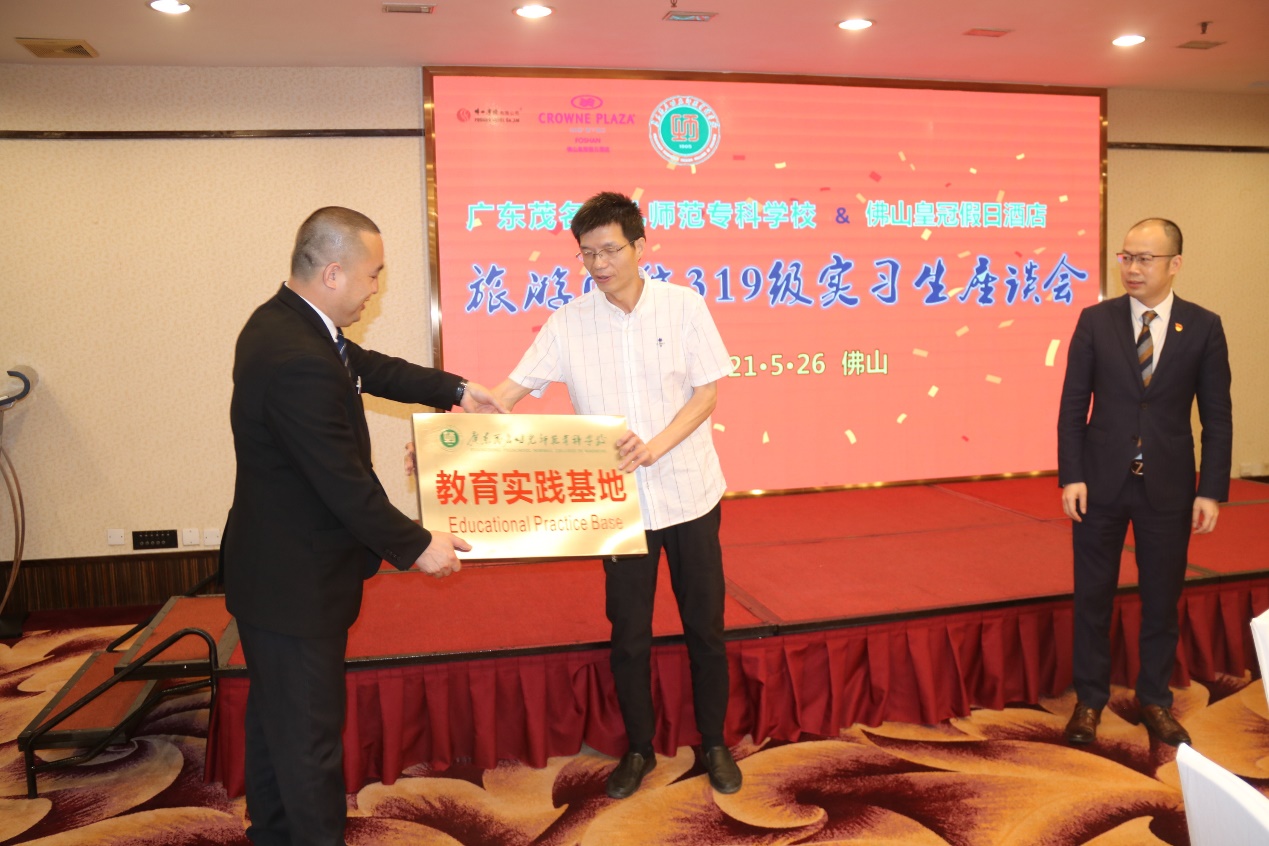 2021年5月26日,旅游学院院长冼周率领学院学工负责人彭章宏、学院专业教师郭飞羽、张苏兰、李超斌前往佛山皇冠假日酒店,看望319级认知实习的学生,并举行教育实践基地授牌仪式。酒店莫振斌总经理、餐饮部黄志刚总监、人力管理部张宝琳总监、劳茂勤副经理等人热情接待了学院领导老师一行。