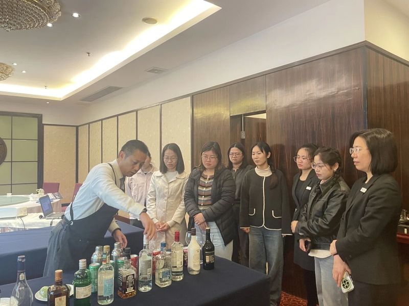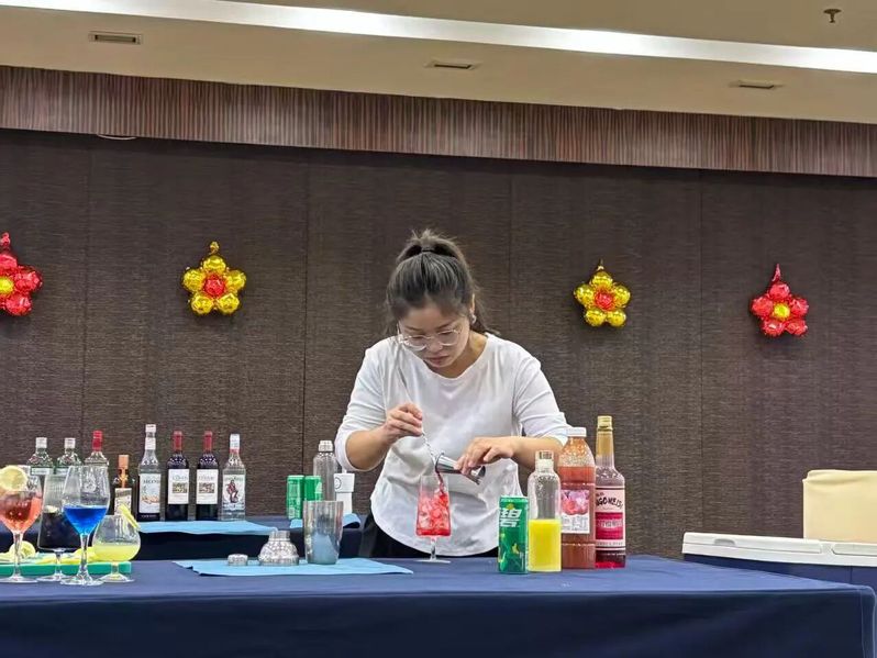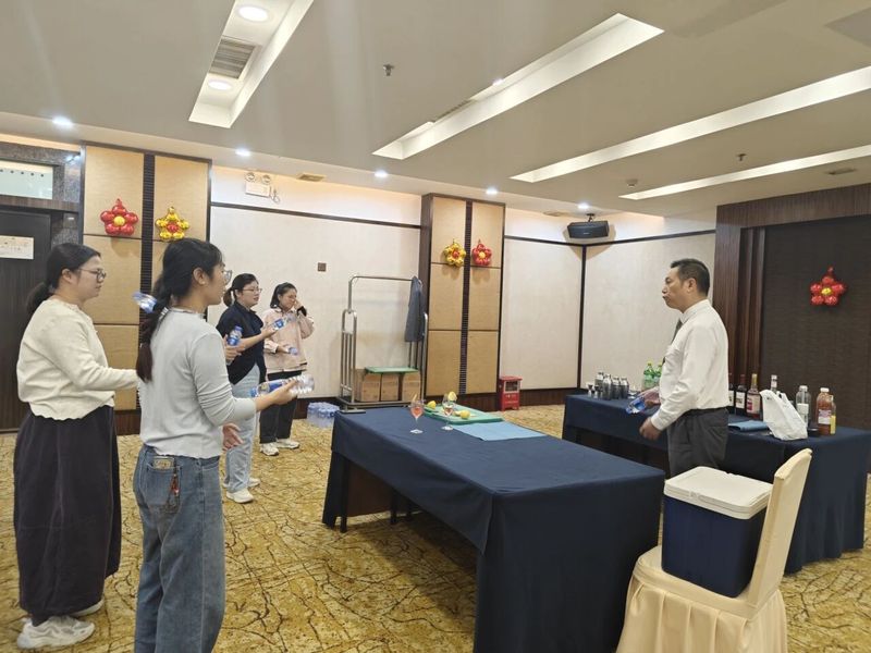 本次活动特设专业调酒课程,由酒店资深调酒师黄总监主讲。课程涵盖六大基酒知识、经典鸡尾酒调制技法等内容。黄总监现场演示了“马天尼”“莫吉托”等饮品的调制过程,讲解关键技巧。教师们随后动手体验,在实操中感受酒店行业对专业技能与创新能力的重视。